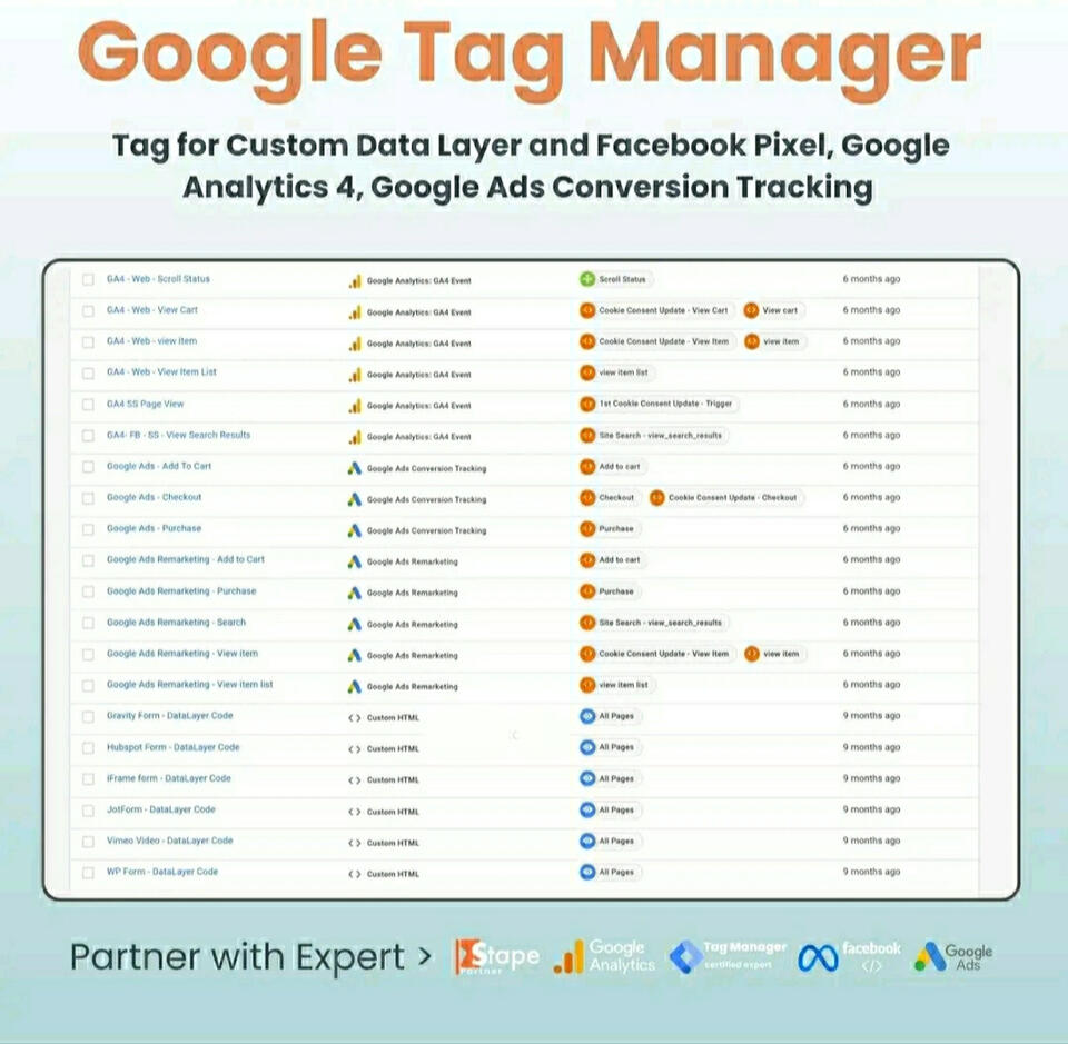 All Custom Events Tracking -(View cart,Remove from cart,Button Clicks,Form submissions.,Phone No. call tracking, Time on Page, Video Engagement, Setup Scroll Depth, Outbound Link Click, Subscribe Event Tracking, Registration Event Tracking, and much more)