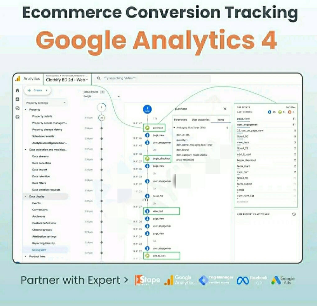 ๐ฅGoogle Analytics 4 Ecommerce Conversion Tracking๐ฅThis project showcases a seamless Google Analytics 4 (GA4) Ecommerce Conversion Tracking setup, designed to provide accurate data collection and in-depth user journey insights. The DebugView panel highlights key conversion events such as:โ